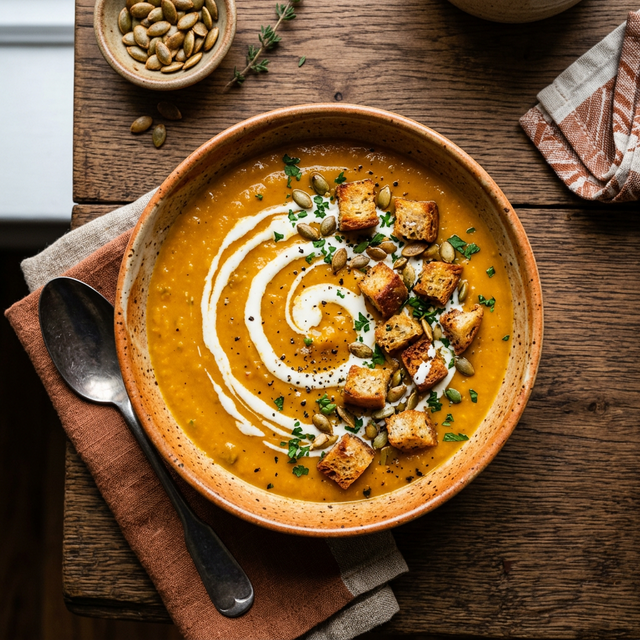 Le potiron est un légume particulièrement intéressant sur le plan nutritionnel : très riche en bêta-carotène (précurseur de la vitamine A), en vitamine C et en fibres, il est aussi très peu calorique (environ 25 kcal pour 100 g). Pour booster encore davantage les apports nutritionnels de ce velouté, vous pouvez ajouter une cuillère à soupe de graines de courge ou de lin au moment du service pour des oméga-3 et du zinc. Incorporer un morceau de gingembre frais (2 cm) pendant la cuisson renforce les propriétés anti-inflammatoires du plat. Enfin, remplacer les croûtons frits par des croûtons au four (pain complet, un filet d'huile d'olive, 10 minutes à 180°C) permet de réduire l'apport en graisses tout en conservant le croquant.